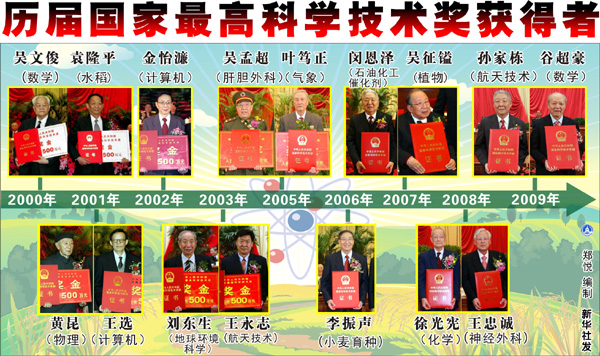 國家最高科學(xué)技術(shù)獎自2000年設(shè)立,歷屆獲獎?wù)叻謩e為:2000年,吳文俊、袁隆平;2001年,王選、黃昆;2002年,金怡濂;2003年,劉東生、王永志;2004年空缺;2005年,葉篤正、吳孟超;2006年,李振聲;2007年,閔恩澤、吳征鎰;2008年,王忠誠、徐光憲,2009年,孫家棟、谷超豪。