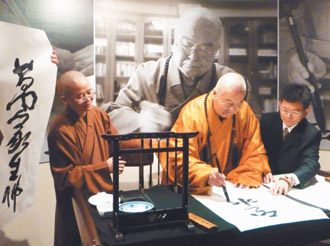 星云大師(中)因糖尿病視力退化,仍揮寫一筆字傳達法語,昨天書寫“云水三千”、“萬家生佛”贈予高雄縣長楊秋興(右)。記者顏福江/攝影