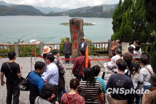 2010年4月29日,來自中國大陸的旅游者在寶島臺灣日月潭排隊攝影留念。 中新社發海牛 攝