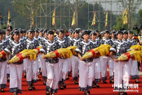 圖為是由80名青春少女組成的五谷方陣。少女們手捧稻、黍、稷、麥、菽五谷形狀的道具,既表達著對炎帝神農“始植五谷”不朽功德的崇敬之情,也祈愿著國泰民安、風調雨順、五谷豐登、欣欣向榮。 (中國臺灣網 徐維彬 攝)