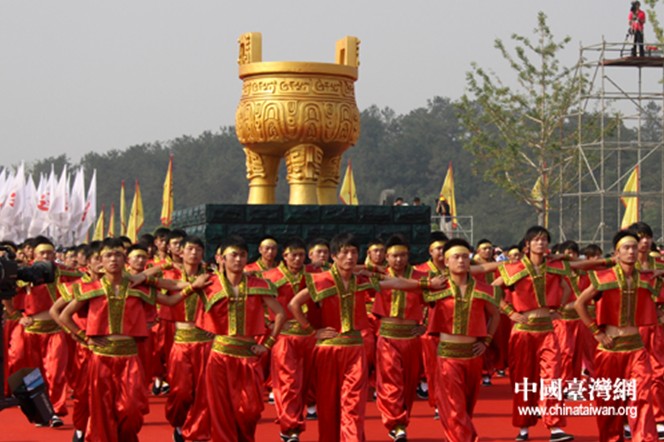 由72名精壯男子組成的古鼎方陣。鼎,在古代象征著國家權(quán)力;在今天則喻示著人民團(tuán)結(jié)、祖國強(qiáng)盛、中華崛起和民族復(fù)興。(中國臺灣網(wǎng) 徐維彬 攝)