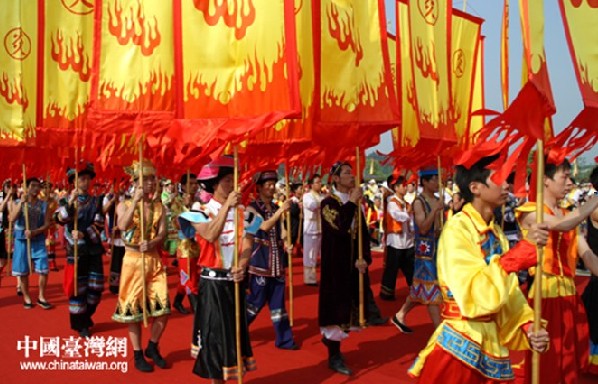 幡旗方陣56個民族代表身著民族盛裝,手擎“炎帝故里尋根節”節徽幡旗,表達著炎黃子孫同尊始祖、中華民族共圖復興的崇高愿望,喻示著炎帝神農所締造的華夏文明必將在綿延傳承中不斷弘揚光大。 (中國臺灣網 徐維彬 攝)