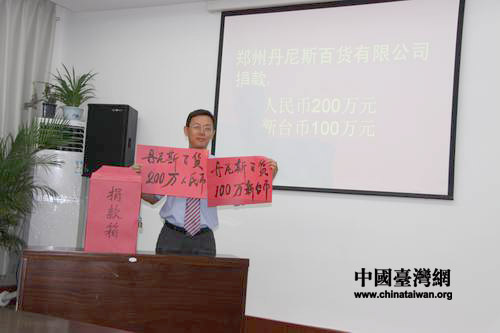 據(jù)悉,參加捐款的首批單位有:河南省臺(tái)辦、鄭州市臺(tái)辦、鄭州丹尼斯百貨有限公司和鄭州市臺(tái)協(xié)所屬有關(guān)臺(tái)資企業(yè)。其中鄭州丹尼斯百貨有限公司捐款200萬(wàn)人民幣,100萬(wàn)新臺(tái)幣。鄭州市臺(tái)協(xié)各企業(yè)捐款14萬(wàn)余元人民幣。(中國(guó)臺(tái)灣網(wǎng) 河南省臺(tái)辦 聯(lián)合報(bào)道)