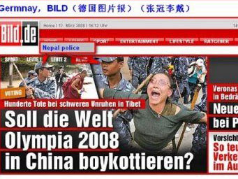 然而,CNN并不是唯一一家歪曲報道西藏事件的媒體,也不是最有“創意”的媒體。《德國畫報》在最近的報道中所使用的圖片顯然比CNN更有“才”。《德國畫報》多次將尼泊爾警察在加德滿都驅散游行示威者的圖片進行裁剪、拼接,然后配在談論北京奧運的文章中,標題竟用“西藏事件升級,應該抵制奧運會嗎?”(人民網4月5日電)