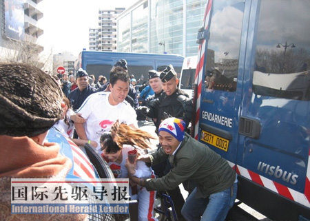 本報記者親眼看到,一個“藏獨”分子突然跳進安全防護欄,旁邊的法國警察眼疾手快,迅速把他按倒在地,然后扔出了安全防護欄。即使遇到一些政客出來挑事,警察也同樣不會客氣。據英國《衛報》記者記述,一個巴黎市綠黨議員在火炬接力開始時突然表示抗議,很快被警察請了出去。然而正如那位中國記者所說,“氣囊”畢竟不是“金鐘罩”。“面對從各個角落蹦出來的搗亂分子,面對搗亂分子亂扔東西,警察們偶爾也會覺得首尾難顧。這時候,現場指揮人員只能讓火炬手上車,甚至主動熄滅火炬。”