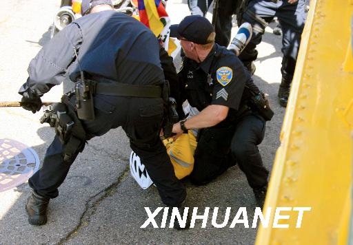 當地時間4月9日,北京時間4月10日,奧運火炬在美國舊金山傳遞時,一名企圖搶奪火炬的“藏獨”分子被當地警察當場制服。新華社記者李穎攝