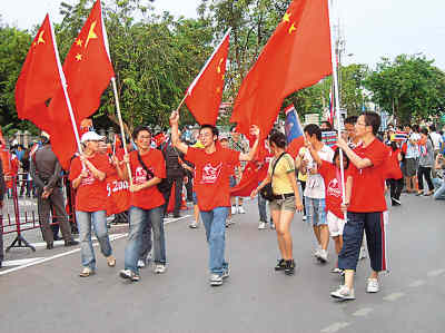 19日,北京奧運圣火到達泰國曼谷,曼谷的學子們張開自己的雙臂,在大雨中用滿腔的熱情點亮了另一盞燃燒在心中的愛國火炬。