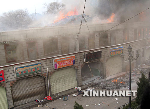 3月14日,拉薩市小昭寺附近的商店正在燃燒。 新華社記者 土登 攝