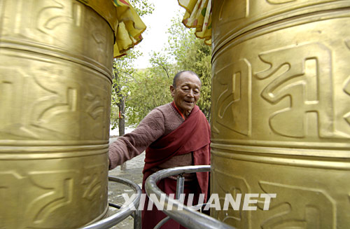 4月28日,一名僧人在色拉寺內轉經筒。 當日,西藏拉薩“三大寺”之一的色拉寺向信教群眾和游客恢復開放,這標志著受“3·14”事件影響的西藏主要寺廟開始逐步全面恢復對外開放。 新華社記者普布扎西攝