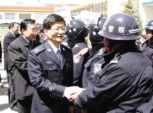 帶著黨中央、國務院和胡錦濤總書記、溫家寶總理對西藏各族人民的深切關懷,3月23日至24日,國務委員、公安部部長孟建柱率中央工作組深入拉薩市的街道、社區、寺廟、派出所等地,視察了西藏在拉薩“3·14”嚴重打砸搶燒暴力事件后維護穩定工作及社會秩序恢復情況。