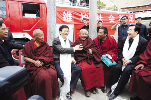在大昭寺、色拉寺和哲蚌寺,孟建柱一行還與寺廟民管會成員及僧眾代表親切交談,向他們宣講黨的民族宗教政策,并了解寺廟穩定及佛事活動的開展情況。孟建柱說,藏傳佛教文化是中華文明的重要組成部分。在我國,宗教信仰自由得到充分保障,正常的佛事活動受到法律保護。但是,任何一種宗教都必須在憲法和法律范圍內活動,不得干預行政、司法、教育等,更不能破壞民族團結,搞分裂破壞活動。拉薩市發生的嚴重打砸搶燒暴力事件,極少數僧尼參與其中,使無辜生靈慘遭涂炭,不僅觸犯了法律,而且這本身就嚴重違背了藏傳佛教的基本教義。達賴口口聲聲說不搞暴力,這次事件再次戳穿了他的謊言,他早已不配做一個真正的佛教徒。希望藏傳佛教界廣大僧眾進一步發揚愛國愛教的光榮傳統,不辜負黨和政府的關心與支持,倍加珍惜來之不易的大好形勢,全力維護社會穩定,堅決反對分裂,努力成為愛國愛教、護國利民、弘揚佛法的高僧大德,為民族團結、社會和諧和西藏發展進步做出應有的貢獻。孟建柱的話得到了廣大僧眾的認同和擁護,他們深有感觸地說:藏傳佛教最基本的教義就是要多做善事、普度眾生,真正的佛教徒絕不會容忍打砸搶燒這樣殘暴的行為!雖然有極少數僧人參與到了“3·14”暴力事件中,但他們是佛門中的敗類,絕不代表廣大藏傳佛教徒的意愿。這些年來,黨和政府不僅高度重視藏傳佛教的發展和各寺廟的維修保護工作,還非常關心廣大僧尼的生活。作為祖國的公民,我們一定會大力弘揚佛法,堅決反對分裂,竭盡全力做好寺廟各項工作,維護正常的宗教秩序,使我們的社會更加和諧、人民更加幸福!