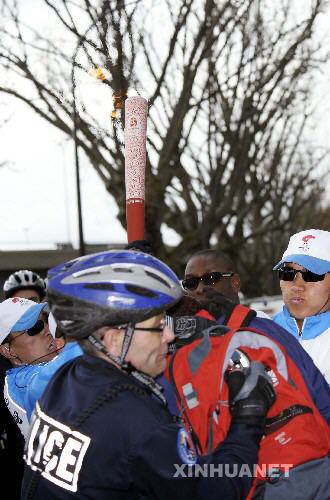 4月7日,北京奧運圣火在巴黎傳遞時遭遇少數“藏獨”分子的干擾破壞,當地警方及時采取措施予以制止。在法國公眾的熱情歡迎下,北京奧運火炬在巴黎安全完成傳遞任務!安鬲殹狈至褎萘Φ膼毫有袕皆獾椒▏娨约盎鹁媸謧兊膹娏易l責。這是巴黎警察及時制止一名擾亂火炬傳遞者試圖從火炬手手中搶奪火炬。 新華社記者戚恒攝