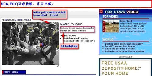 美國FOX新聞網(wǎng)將一張印度軍人拖走示威者的圖片,配上“中國軍隊將示威者拷走”的說明。