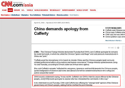 CNN在不久前關于西藏事件的報道,就曾惡意剪裁圖片,并“誤稱”西藏為“國家”,顯示其所謂的新聞自由在偏見主宰下,常常干出渲染夸張﹑移花接木﹑斷章取意﹑指鹿為馬的奇事。而此番卡弗蒂于奧運火炬在歐美數國遭遇阻撓的敏感時刻,大開罵戒,則亮出了他勢與中國和中國人過不去的架式與底牌,更喪失了一個媒體人的公正與風度。難怪中國網民已經流傳“做人不要太CNN。”