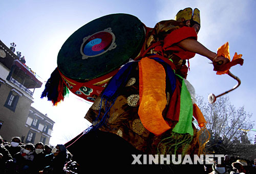 為了保護西藏傳統文化,在過去20多年里,國家先后投入了超過7億元的資金,維修并開放了包括布達拉宮在內的重要古文物建筑和寺廟1400多處。從今年開始,國家還將投入5.7億元對西藏22處歷史文物建筑進行維修,這是中央政府在西藏實施的一次性投入最多、規模最大的文物維修工程。圖為一名僧人在表演跳神(2007年2月21日攝)。 新華社記者 普布扎西攝