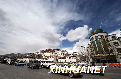 車輛行駛在拉薩北京中路布達拉宮前。新華社記者 覺果 攝