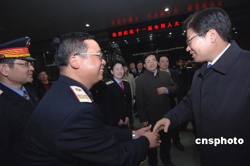 三月二日晨,參加十一屆全國人大一次會議的湖南省委書記張春賢(右一)乘火車抵京時,在北京火車站特意向鐵路員工表示感謝。湖南是今年年初遭受冰雪凍災的重災區,鐵道部員工為恢復湖南鐵路運輸和救災做出貢獻。 中新社發 王東明 攝