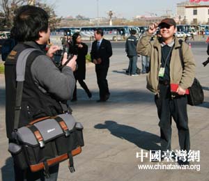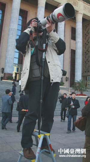 中國臺灣網3月3日北京消息 中國人民政治協商會議第十一屆全國委員會第一次會議今天下午在北京人民大會堂開幕。今年采訪政協全體會議的國內外新聞媒體共有400余家,記者3000多人。經常躲在鏡頭背后的媒體同行們,今天也成為了記者鏡頭的主角。(張弛 攝)