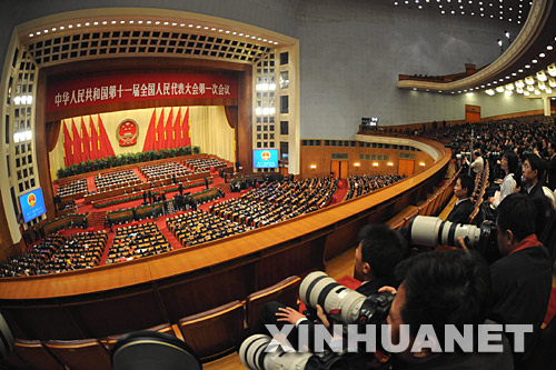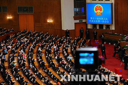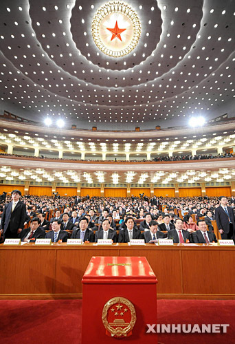 3月16日,十一屆全國人大一次會議在北京人民大會堂舉行第六次全體會議。決定國務院總理人選;決定中華人民共和國中央軍事委員會副主席、委員人選;選舉最高人民法院院長;選舉最高人民檢察院檢察長。這是大會會場。 新華社記者李濤攝 |