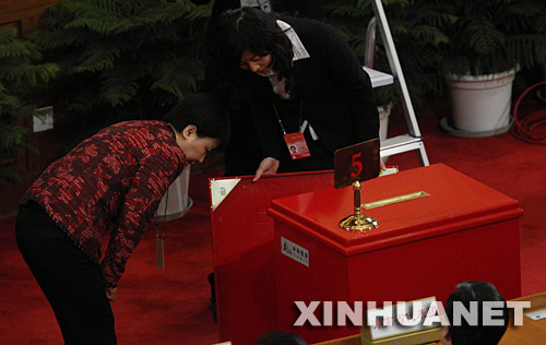 3月16日,十一屆全國人大一次會議在北京人民大會堂舉行第六次全體會議。決定國務院總理人選;決定中華人民共和國中央軍事委員會副主席、委員人選;選舉最高人民法院院長;選舉最高人民檢察院檢察長。這是代表們在查看選票。 新華社記者楊宗友 攝