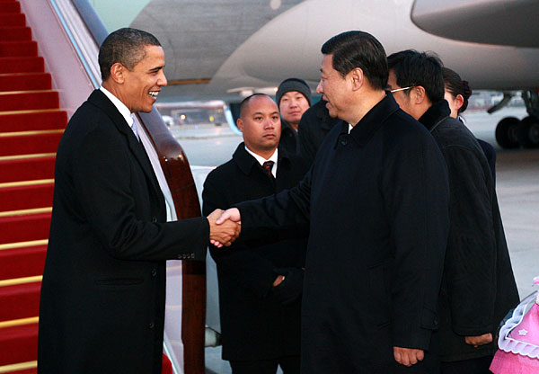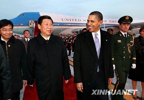 11月16日下午,美國(guó)總統(tǒng)奧巴馬乘專機(jī)從上海飛抵北京,國(guó)家副主席習(xí)近平前往北京首都國(guó)際機(jī)場(chǎng)迎接。新華社記者 龐興雷 攝