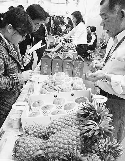 大陸居民在海峽兩岸農(nóng)展會上挑選臺灣水果。