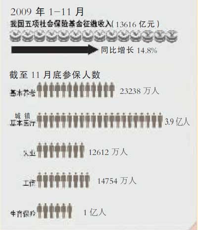 2009年,中央財政安排社會保障資金2930億元,比上年增長17.6%。目前,全國新農保參保農民每月至少可以領55元養老金。到年底,我國基本醫療保險制度將覆蓋超過12億人。