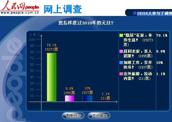 截至1月3日12時(shí)12分,共有19316位網(wǎng)友參與投票,79.1%的網(wǎng)友表示要"隱居"在家,休養(yǎng)生息,為2010年工作與生活的各方面再上一個(gè)臺(tái)階做好充分的準(zhǔn)備。10%的網(wǎng)友投票表示要加班工作,雖然很辛苦,但是想到可以拿到加班工資,仍然感到很快樂。9.8%的網(wǎng)友表示要趁著三天假期趕回老家,與親人團(tuán)聚,共同迎接新年的到來,將錯(cuò)過的時(shí)光彌補(bǔ)回來。還有1.1%的網(wǎng)友對山水風(fēng)光很著迷,他們表示要外出旅游,拉動(dòng)內(nèi)需,一邊游歷一邊給國家做貢獻(xiàn)。