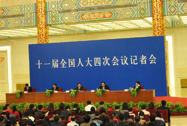 2011年3月6日,國家發(fā)展和改革委員會主任張平,國家發(fā)展和改革委員會副主任朱之鑫、徐憲平,談關于“十二五”規(guī)劃綱要,并答記者問。圖為大會主席臺。宋君毅 攝