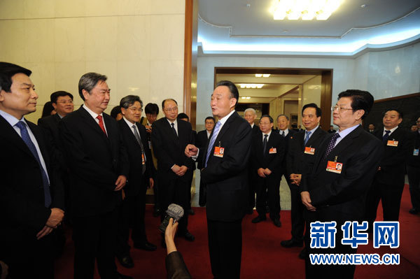 3月13日,中共中央政治局常委、全國人大常委會委員長吳邦國在北京人民大會堂看望參加兩會新聞報道工作的中央新聞單位負責人。新華社記者 李學仁 攝