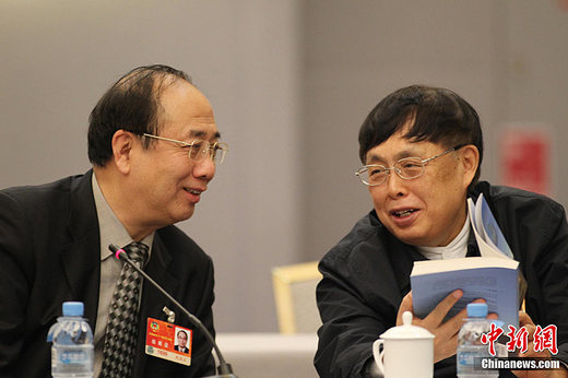 3月10日,全國政協(xié)發(fā)言人趙啟正(左)與陳毅之子、中國人民對外友好協(xié)會會長陳昊蘇在全國政協(xié)小組討論會上共話公共外交。中新社發(fā) 王中舉 攝