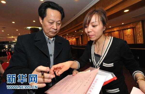 3月1日,一名北京國際飯店委員駐點的醫療組工作人員(右)向全國政協委員汪國新發放健康提示卡。當日,出席全國政協十一屆四次會議的委員陸續抵京,在北京國際飯店委員駐點,工作人員和大會接待人員已經做好各方面準備,迎接委員的到來。 新華社記者岳月偉攝