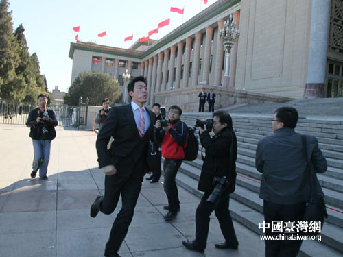 中國臺灣網3月3日北京消息 3月3日下午,全國政協十一屆在人民大會堂開幕。全國政協委員劉翔為躲避記者的采訪,一個人悄悄想從大會堂南側“混”進會場,沒想到還是被眼尖的記者發現,不得不和記者玩起了百米賽跑。