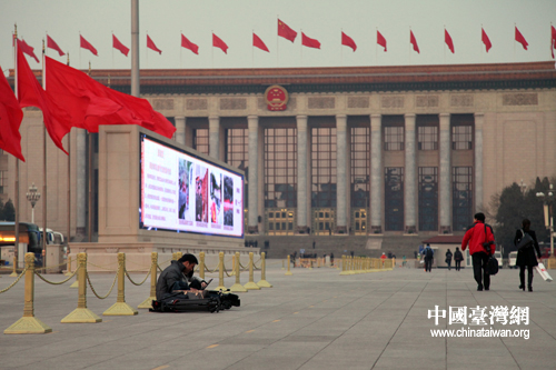 天安門廣場(chǎng)上兩塊大屏幕正在播放宣傳片。肖春陽(yáng)、劉洋攝影報(bào)道