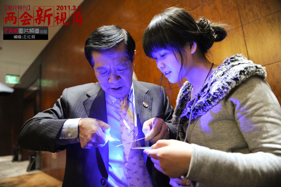 3月6日,作為海外僑胞列席全國政協(xié)十一屆四次會議的華人“神探”李昌鈺,在會議間隙向采訪他的記者贈送他自己研制的光波鑒識器。李昌鈺因鑒識過辛普森殺妻案、9·11恐怖襲擊事件、臺灣3·19槍擊案等大案而名震全球。中新社記者 廖攀 攝
