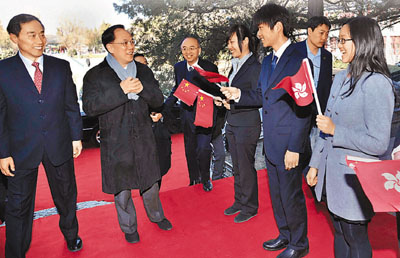 特首曾蔭權(quán)(左二)抵達(dá)北京大學(xué)校園,受到學(xué)生歡迎。圖片來(lái)源:香港文匯報(bào)