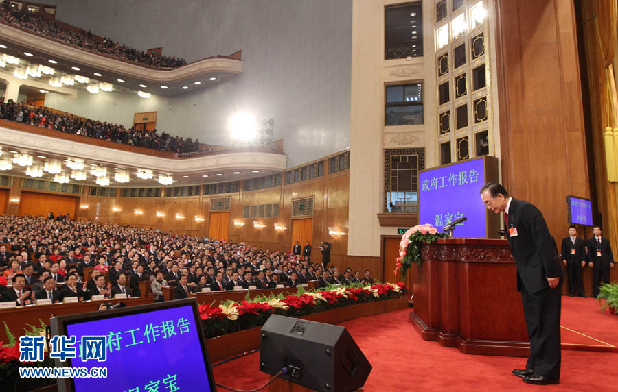 3月5日,第十一屆全國人民代表大會第四次會議在北京人民大會堂開幕。這是國務院總理溫家寶作政府工作報告前向全體代表鞠躬。新華社記者蘭紅光攝