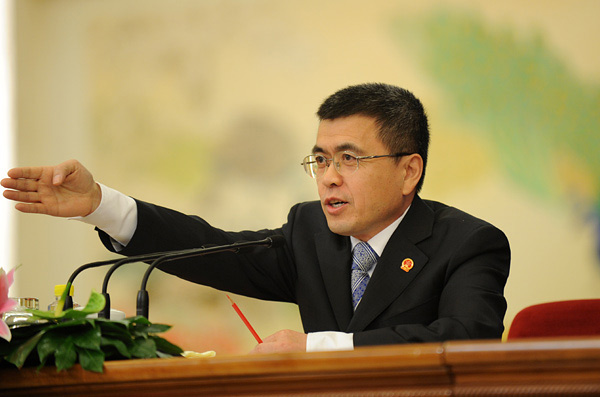 2011年3月7日10時(shí),十一屆全國人大四次會(huì)議在人民大會(huì)堂三樓金色大廳舉行中外記者會(huì),外交部部長楊潔篪就我國的對外政策和對外關(guān)系回答中外記者提問。圖為全國人大常委會(huì)辦公廳新聞局局長闞珂。翟子赫 攝