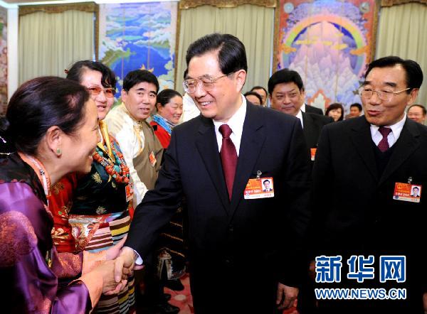 3月6日,中共中央總書記、國家主席、中央軍委主席胡錦濤參加十一屆全國人大四次會(huì)議西藏代表團(tuán)的審議。這是胡錦濤同代表們親切交談。新華社記者 李學(xué)仁攝