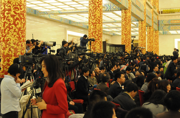 2011年3月14日10時(shí),溫家寶總理在人民大會(huì)堂三樓金色大廳與中外記者見(jiàn)面并答問(wèn)。這是記者在現(xiàn)場(chǎng)采訪拍攝。宋巖 攝