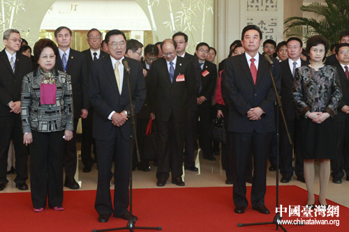 圖片說明:出席第七次兩岸兩會領導人會談的海基會董事長江丙坤一行今日中午抵達天津,海協會會長陳云林及相關人員在天津迎賓館歡迎海基會協商代表團的到來。(中國臺灣網 陳佳慧 攝)