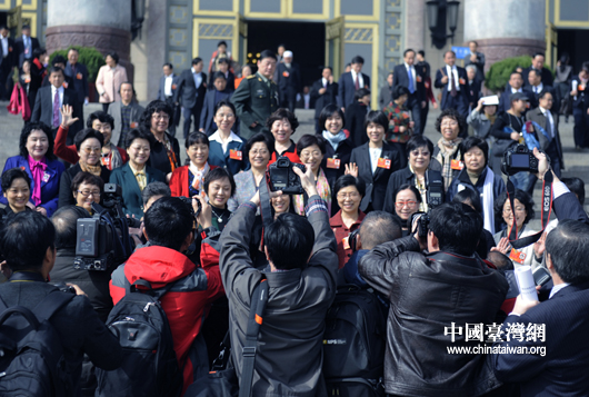 在天安門廣場上,女委員成為媒體記者追捧的焦點。(中國臺灣網(wǎng) 發(fā))