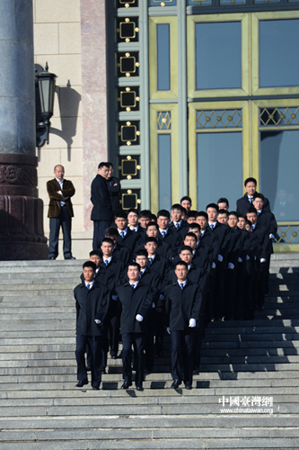 會議結束后,安保人員列隊雄姿英發走出人民大會堂。