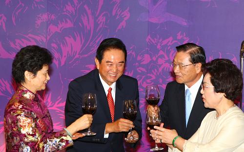 11月3日晚,;鶗(huì)在臺(tái)北101大樓舉行宴會(huì),歡迎陳云林會(huì)長率領(lǐng)的海協(xié)會(huì)協(xié)商代表團(tuán)。這是陳云林夫婦和江丙坤夫婦共同舉杯。新華社記者 邢廣利 攝