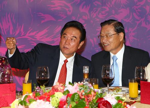 11月3日晚,;鶗(huì)在臺(tái)北101大樓舉行宴會(huì),歡迎陳云林會(huì)長率領(lǐng)的海協(xié)會(huì)協(xié)商代表團(tuán)。這是陳云林和江丙坤在宴會(huì)上交談。新華社記者 邢廣利 攝