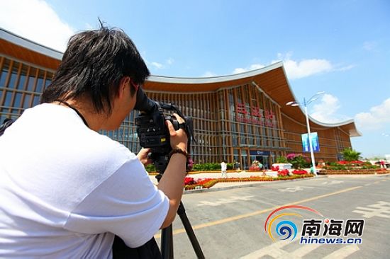 境外媒體記者正在用攝像機記錄美麗的三亞火車站(南海網記者 駱云飛)
