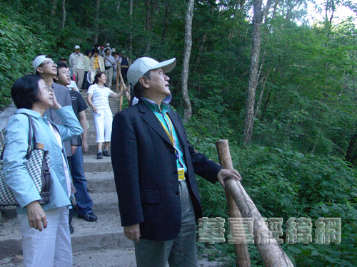 下午訪問團(tuán)赴鏡泊湖地下森林參觀。鏡泊湖地下森林位于黑龍江省牡丹市境內(nèi)。地下森林是古代火山噴發(fā)之后在凹陷的火山口繼續(xù)長出的森林,它們長在露天,承受著陽光和雨露,只是因?yàn)樗鼈兩L在火山口,即深陷于地面之下。