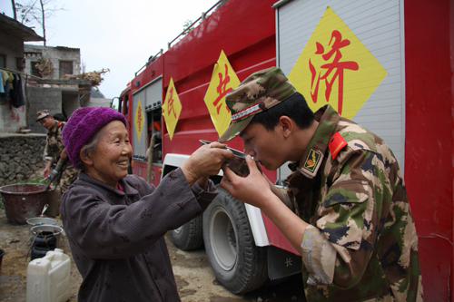 “現在好了,有了消防官兵送水,我們就放心了!”村婦聯主任楊春節快言快語地說,從本周起,消防官兵就開始為他們送水,讓村民們對戰勝特大旱災充滿了信心。