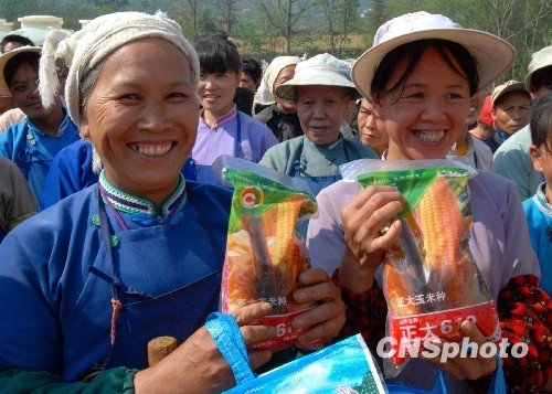 4月12日,在廣西特大干旱縣——那坡縣龍合鄉(xiāng)信合村田間地頭,自治區(qū)農(nóng)業(yè)專家將耐旱高產(chǎn)玉米良種贈(zèng)送給受災(zāi)的農(nóng)民。當(dāng)日,廣西壯族自治區(qū)農(nóng)業(yè)廳在遭受特大旱災(zāi)的那坡縣和鳳山縣舉辦“抗旱救災(zāi)種子”捐贈(zèng)儀式,現(xiàn)場(chǎng)將從外省緊急采購(gòu)回來的總價(jià)值48萬(wàn)元的3萬(wàn)斤耐旱高產(chǎn)玉米良種,贈(zèng)送給兩縣遭受嚴(yán)重旱災(zāi)的3000多戶農(nóng)民,幫助他們搶種補(bǔ)種,恢復(fù)生產(chǎn)。中新社發(fā)喻湘泉攝