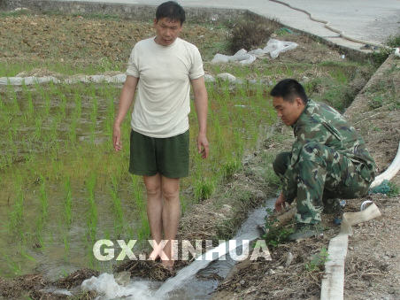 4月10日上午,武警百色市邊防支隊(duì)的“抗旱保苗突擊隊(duì)”為群眾澆灌秧苗。(趙園畢 攝)